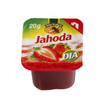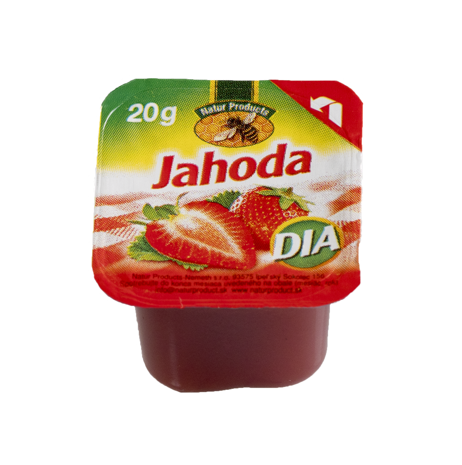 Zloženie: jahody a jablková dreň (99%), sladidlo: aspartam, regulátor kyslosti: kys. citrónová, želírujúca látka:pektín, konzervačné látky:benzoan sodný, sorban draselný, príchuť: jahodová, farbivo:karot